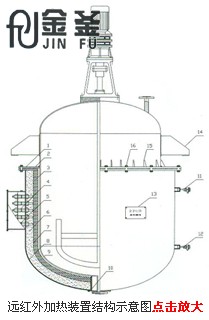 遠紅外加熱裝置結構示意圖標注說明: 1:固定法蘭 2、連接法蘭 3、遠紅外輻射加熱區 4、接線柱 5、接線盒 6、硅酸鋁保溫層 7、絕緣云母板 8、加熱器金屬外殼 9、用戶反應釜膽 10、防爆密封件 11、遠紅外上段測溫探頭 12、遠紅外下段測溫探頭 13、銘牌 14、反應釜支耳 15、三角形加強版 16、法蘭連接螺栓